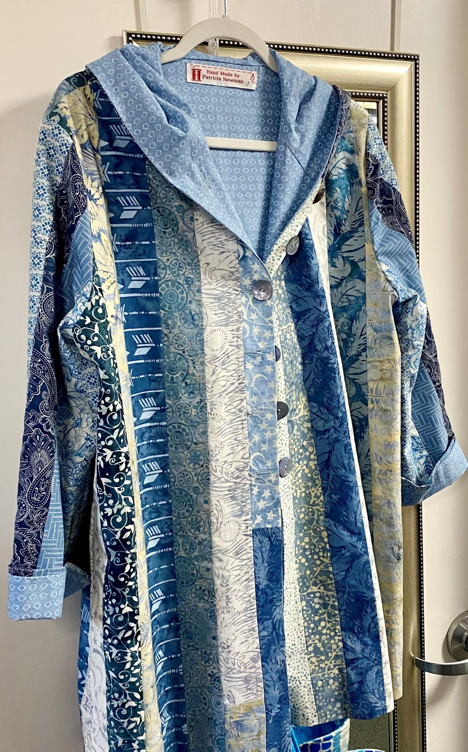The simplicity of the Nyla Jacket design combined with the bright, bold fabric makes for a wonderful and wearable garment. It is the ideal jacket for those slightly cool autumn and spring days. The HUGE hood makes it very cozy and attractive and it has deep pockets. Easy to sew, wonderful to wear – what is not to like?! Make yours from two identical jelly rolls OR use a lightweight to medium weight fabric that you absolutely love! This is a multi-size pattern: all sizes from S to 3 XL are on the same pattern. It was created for a person approximately 5’6″ tall. If your height is above or below, you may adjust pattern length by a few inches to the bottom of the pattern.